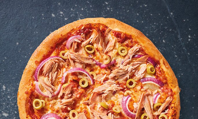 Tomato sauce, mozzarella, tuna, green olives, red onion, and garlic oil on the edge.